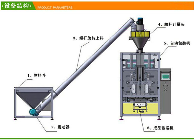 接通電源將溫度設(shè)置恒溫→設(shè)置包裝機參數(shù)(制袋尺寸及包裝重量)→人工上料到儲料斗振動下料至螺桿提升機→螺桿計量器→包裝機→打印生產(chǎn)日期→制袋→充填物料→充氣→封合包裝→切斷→包裝成品輸出全過程;