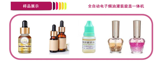 該機(jī)主要適用于50毫升以?xún)?nèi)電子煙油、滴眼液、指甲油、眼影、精油等產(chǎn)品的自動(dòng)灌裝、加塞和旋蓋。
