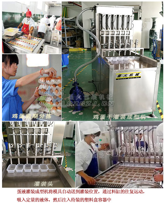 蛋液經(jīng)過攪拌之后就進(jìn)入了定型程序,蛋液灌裝成型機(jī)將模具自動送到灌裝位置,蛋液灌裝機(jī)的計(jì)量缸分別連接灌裝頭,通過料缸的往復(fù)運(yùn)動,吸入定量的液體,然后注入待裝的塑料盒容器中;整機(jī)采用全不銹鋼產(chǎn)品制成,拆裝簡單,易清洗,符合食品衛(wèi)生要求,氣動定量灌裝,六個灌裝嘴同時出料,結(jié)構(gòu)合理,操作方便,易于維護(hù),維修,便于清洗;雞蛋干蛋液灌裝成型機(jī)已成為雞蛋干生產(chǎn)線中必不可少的灌裝設(shè)備;雞蛋干灌裝成型后,然后鹵制,較后經(jīng)過真空包裝機(jī)包裝,成品基本上就完成啦