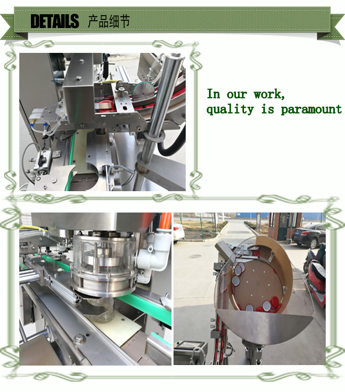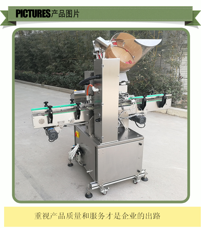 自動(dòng)真空旋蓋機(jī)機(jī)是我司多名具有豐富經(jīng)驗(yàn)的高級(jí)工程師研發(fā),集自動(dòng)理蓋、上蓋、自動(dòng)抽真空旋蓋于一體,手用真空泵抽真空的方式,可獲得很高的真空度。具有無瓶不送蓋,缺蓋自動(dòng)報(bào)警功能,自動(dòng)化程度高,主要?dú)鈩?dòng)及電器元件采用國際知名品牌,性能穩(wěn)定可靠,廣泛適用于食品罐頭、飲料、調(diào)味品、保健品等行業(yè)中玻璃瓶、馬口鐵蓋的真空旋蓋。